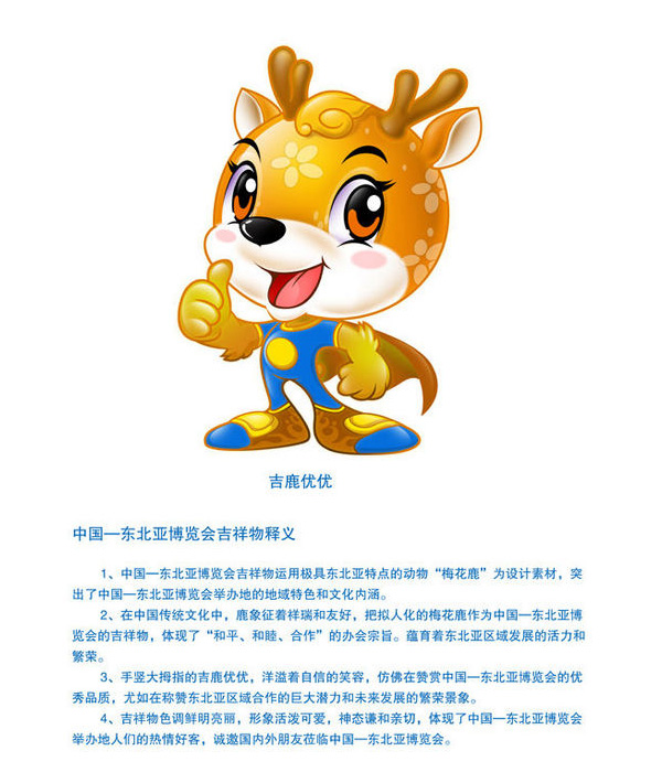 1、第九屆中國(guó)—東北亞博覽會(huì)吉祥物運(yùn)用極具東北亞特點(diǎn)的動(dòng)物“梅花鹿”為設(shè)計(jì)素材,突出了中國(guó)—東北亞博覽會(huì)舉辦地的地域特色和文化內(nèi)涵。