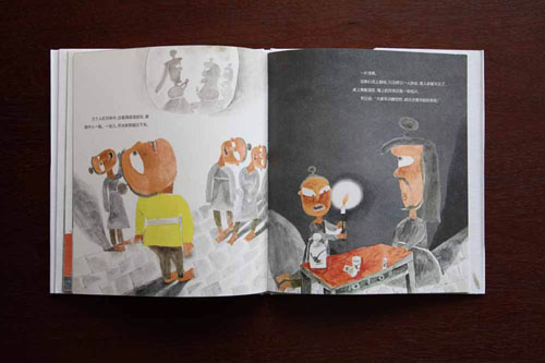 《穿墻術(shù)》(浙江少年兒童出版社) 繪圖表現(xiàn)力強(qiáng),以暖色調(diào)營造了很好的氛圍;文字與繪圖協(xié)調(diào)一致,位置編排合理,圖片的視角一直在變化,富有節(jié)奏感;合和頁構(gòu)建了寬闊的閱讀空間,人物如同舞臺表演一樣,生動形象;版權(quán)頁與正文不放在一個合和頁上會更好,封面的紙板稍嫌厚重。