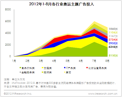 iAdTracker最新數(shù)據(jù)顯示,廣告主在倫敦奧運(yùn)預(yù)熱期的7月投放費(fèi)用尤其顯著,食品飲料類和交通類廣告投入最為突出。2012年4月起,奧運(yùn)主題廣告開始較為密集的投放,一直持續(xù)到6月。7月奧運(yùn)主題廣告投放出現(xiàn)高峰,8月投放費(fèi)用出現(xiàn)回落。各行業(yè)中,食品飲料類和交通類廣告投入最顯著,另外IT產(chǎn)品類和化妝浴室用品類也有一定的投放費(fèi)用。