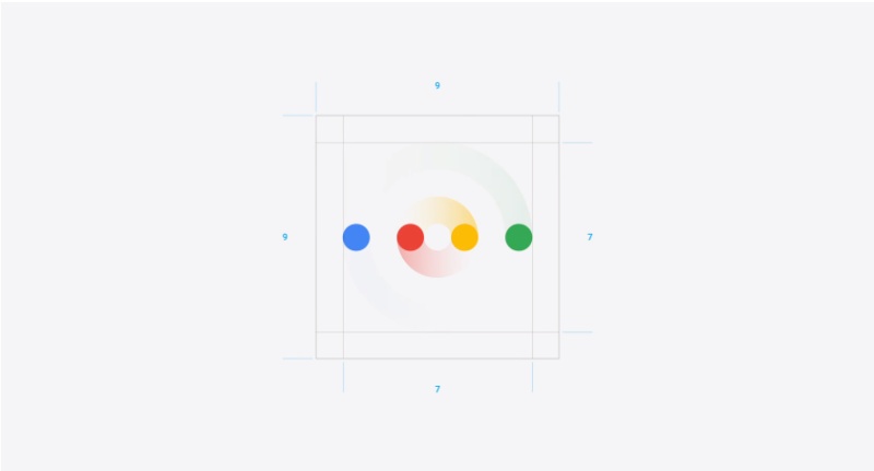 Google G是直接來源于logo中的”G”,但是針對(duì)小尺寸的顯示而比 logo 中的 G 具有更大的字重。它被設(shè)計(jì)在同樣的網(wǎng)格中,作為我們的產(chǎn)品圖標(biāo)符號(hào)。這個(gè)圓形被升華為防止視覺上的“重復(fù)”。“G”中的色彩比例包含了logo中的全部顏色,顏色的順序能幫助人眼圍繞字母運(yùn)動(dòng)。這些點(diǎn)沿著幾何弧線運(yùn)動(dòng),遵循了一套曲線優(yōu)雅運(yùn)動(dòng)的標(biāo)準(zhǔn)。