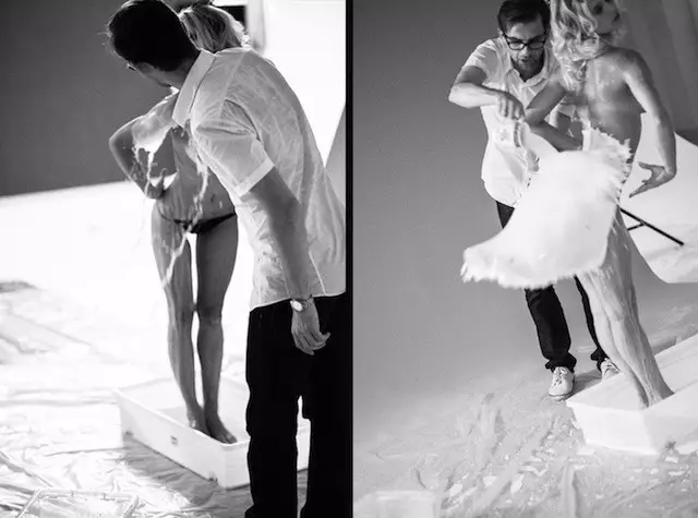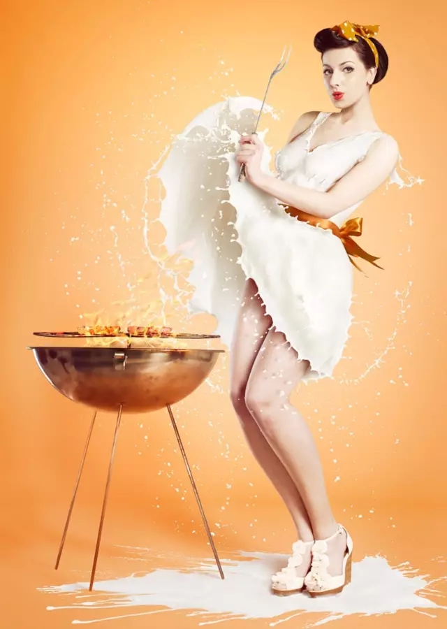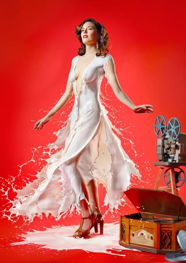 照片中,模特們大多被裝扮成上世紀(jì)“畫(huà)報(bào)女郎”的外形,牛奶順著她們的身體淌下,形成了一件件各具特色的美麗長(zhǎng)裙。