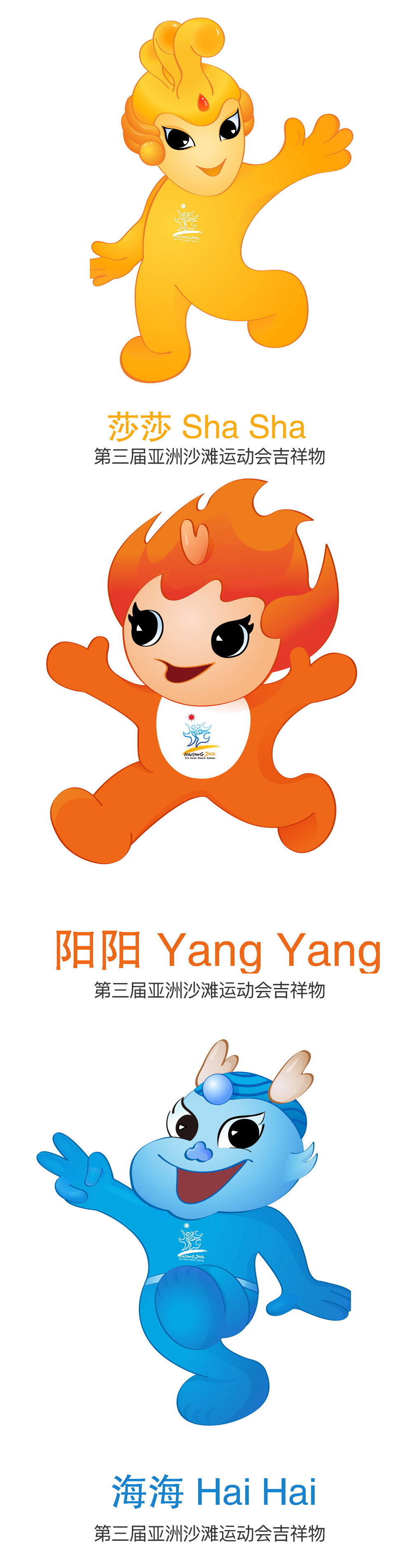 不過2012年的吉祥物就有點喜歡不起來了。據(jù)當(dāng)時的介紹,吉祥物的主創(chuàng)團隊來自清華美院,這三卡通人物形象以「龍」、「太陽」、「鳳」為原型,分別代表海水、陽光、沙灘。