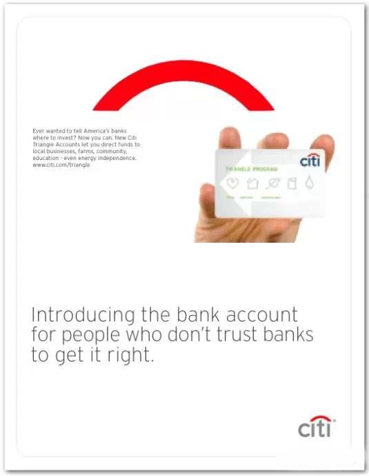 CITI銀行的廣告簡潔大氣,但統(tǒng)一延用了標識的核心基因——代表傘的紅色圓弧,顯得很聚焦且有品牌識別力。