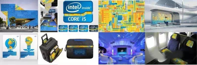 英特爾(intel)品牌設計了一個類似于“芯片”內(nèi)部結(jié)構(gòu)的輔助圖案,并以金黃色作為主色調(diào)。該圖案與品牌標準色“英特爾藍”配合協(xié)同運用,相互映襯,出現(xiàn)在建筑物外部和內(nèi)部空間、各種品牌廣告、品牌制作物以及品牌ICON(圖標)中,具有極其鮮明的獨特識別性,為該品牌注入了無盡活力。這個輔助圖案也作為芯片產(chǎn)品的一種“存在”象征,在放大品牌形象的同時,通過在各種品牌接觸點的廣告運用,也營造了無所不在、無所不能的品牌聯(lián)想。