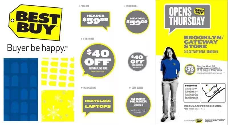 百思買標志的主色為黃色、藍色,輔助色為黑色、灰色和紅色。該品牌輔助圖形包括“標簽圖形”“對話框”“文本氣泡”“價格框”“價格氣泡”“標題區(qū)”等多樣化的運用形式,每一種形式都有不同的目的和內(nèi)容規(guī)范相對應。