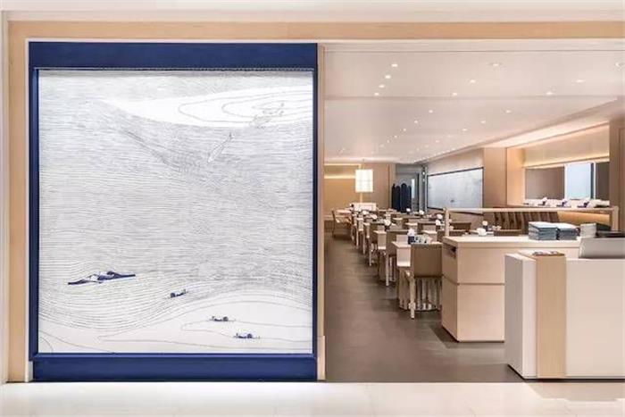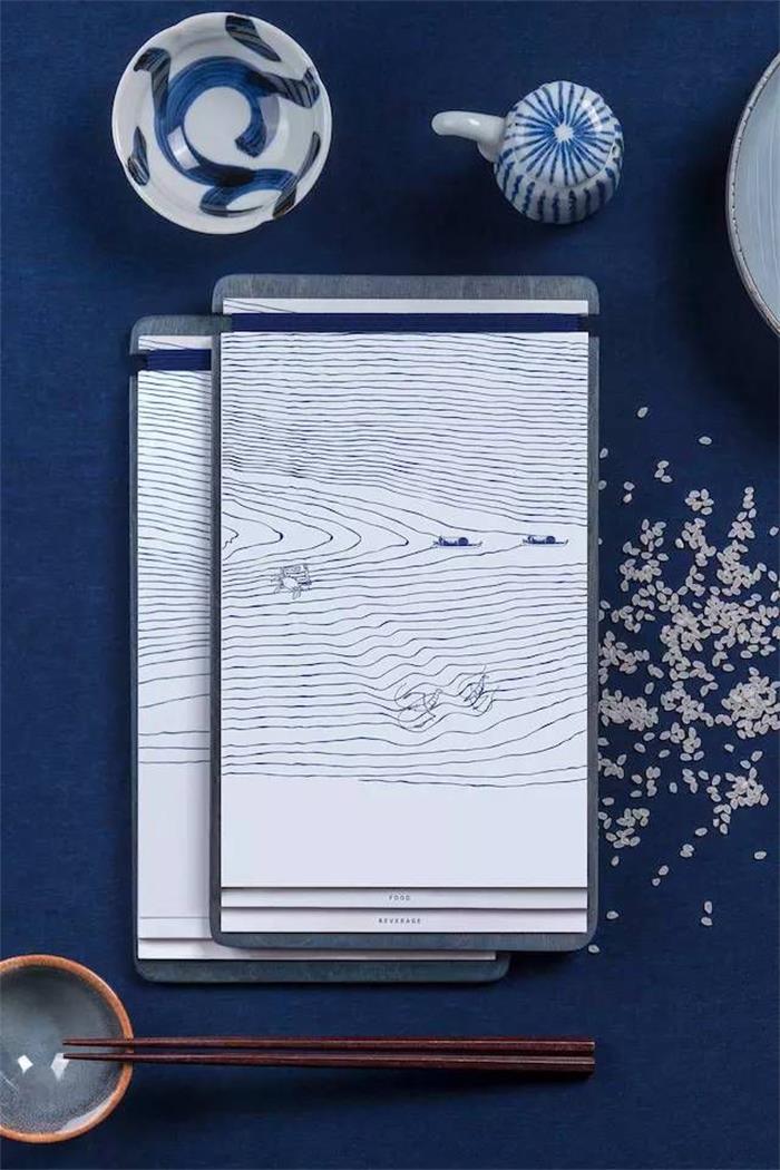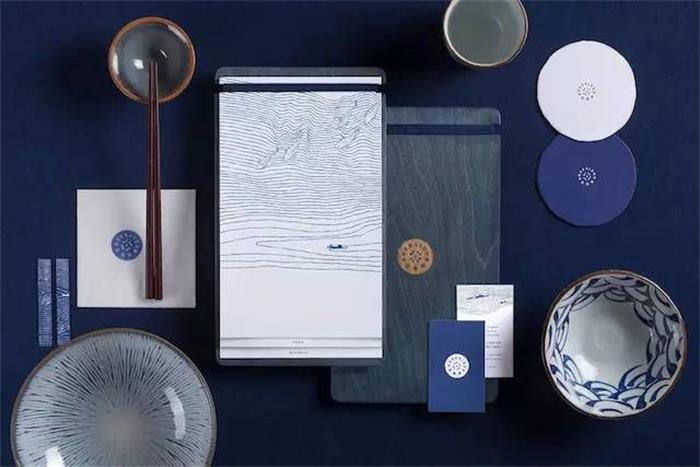 說起日式風(fēng),肯定少不了日料店。這家日料餐廳,以日本傳統(tǒng)花紋樣式青海波為品牌主要視覺元素,通過靛藍(lán)色和白色混搭的青海波圖案,呈現(xiàn)出自由開放的樣貌。簡約流動(dòng)的線條,與插圖結(jié)合,頗有意趣。不僅將日本民間文藝元素進(jìn)行圖形化展示,也是餐廳提供新鮮食材的一種比喻性表現(xiàn)。餐廳的LOGO以一個(gè)簡化的圓形米飯碗樣式進(jìn)行呈現(xiàn),圖形居中,文字進(jìn)行環(huán)繞,簡約中又有立體突出的效果。