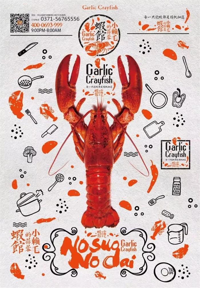 小賴毛的蒜蓉蝦館采用濃厚的色彩來(lái),表現(xiàn)海鮮的鮮與兇猛,大膽的紅白黑撞色能從感官上刺激食欲,手繪圖案搭配兇猛小龍蝦,手繪風(fēng)與寫實(shí)風(fēng)的碰撞帶來(lái)強(qiáng)烈的視覺(jué)效果。以眾多細(xì)小的廚房用品為輔助圖形,細(xì)節(jié)感與層次感up up up,涂鴉風(fēng)格的應(yīng)用很年輕時(shí)尚。