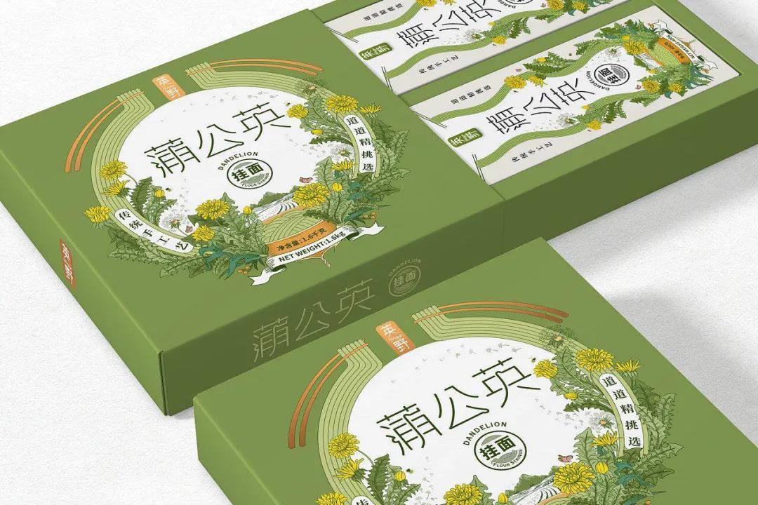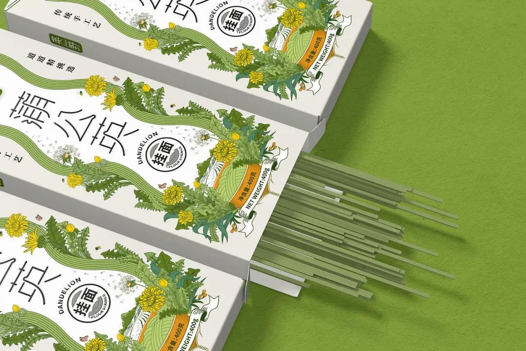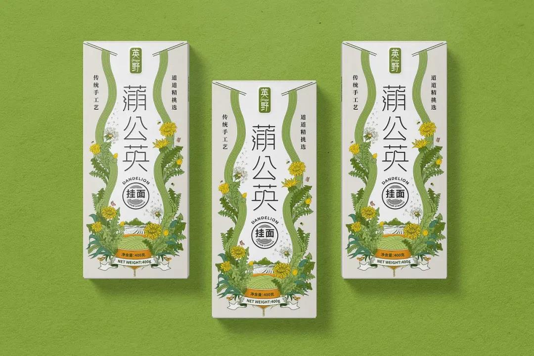 榮獲麗水山耕包裝設(shè)計(jì)獎(jiǎng)的掛面品牌,以蒲公英為設(shè)計(jì)主題,清新質(zhì)樸的設(shè)計(jì)元素,完美呈現(xiàn)天然健康的產(chǎn)品理念。其中的插畫設(shè)計(jì)是尤為出彩的地方,使用場(chǎng)景設(shè)定的方式,自然地融合蒲公英和面條兩大元素,直觀表達(dá)出產(chǎn)品的特性。插畫中設(shè)計(jì)有盛著掛面的碗,從兩側(cè)延伸出細(xì)長(zhǎng)柔軟的綠色掛面,而蒲公英則圍繞在面條周圍,蜜蜂與蝴蝶的點(diǎn)綴搭配山巒田園美景,使得包裝充滿活力生機(jī)的大自然氣息。