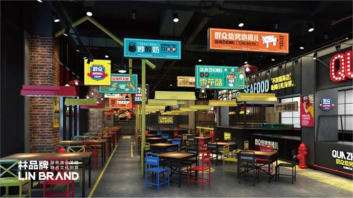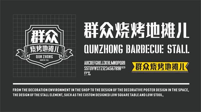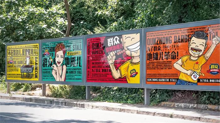 這個燒烤品牌是基于群眾的定位而進行命名的,群眾燒烤地攤兒,既表明品牌是面向大眾的、百姓的,在價格上也是親民的,同時又體現(xiàn)街頭市井文化,突出燒烤品類接地氣的品類屬性。品牌的LOGO標志采用了徽章式圖標,徽章與盾牌符號相結合,體現(xiàn)食品的安全性;紅旗飄帶體現(xiàn)革命屬性,也象征著只是一次燒烤改革;群眾二字格外顯眼,強調(diào)品牌的大眾親民,這些元素重新組合,構成超級圖標。革命是品牌的主題,“為了群眾,地攤兒革命”,是對地攤兒燒烤中觸發(fā)的衛(wèi)生問題進行的改革,“以前街邊找,現(xiàn)在屋里烤”是革命后的成果,用簡單直白的話語,說清品牌的革命方向。將地攤兒文化轉移到室內(nèi),氛圍不能少,基于大眾地攤定位,以生活中的男孩、女孩、燒烤大叔等市井人物為形象,以及地攤兒的場景運用插畫的形式情景再現(xiàn),還原生動有趣的地攤兒盛景。生動有趣的形象搭配俏皮的地攤兒方言,一切以群眾為中心,產(chǎn)品可靠、價格實惠,營造地攤兒熱鬧有趣的氛圍。用半寫實的表現(xiàn)手法來呈現(xiàn)地攤兒產(chǎn)品,虛實之間,盡是對地攤兒燒烤文化的喜愛和重視。