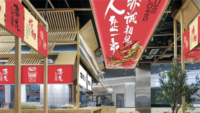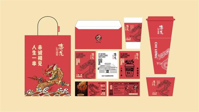 這個炸串品牌叫赤龍炸串圍繞赤龍的品牌名,原創(chuàng)手繪出一條翻江倒海,爪持串物的龍形象,LOGO設計是中文字體和拼音的結合,赤龍二字用毛筆揮斥而成。赤龍的拼音在和串屋二字連結,重在突出赤龍的品牌名稱。輔助圖形采用日式匠心經(jīng)典“燒鳥”造型,結合本地傳統(tǒng)炸串演繹誕生出新一代解饞美味。不論是獨自一人釋放對食物垂涎的欲望,還是與老友相聚發(fā)泄日常生活的某種情緒,擼串無疑是釋放的最佳途徑,所以赤龍炸串提出了人生一串,赤誠相見的廣告語。