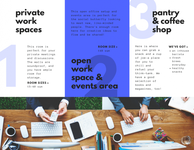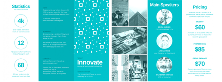 不想讓你的三折頁受到忽視?設(shè)計時使用上明亮的色彩襯托你的展品是個不錯的方法。如果是用你自己的品牌色進行配色,就使用最明亮的那個配色吧。