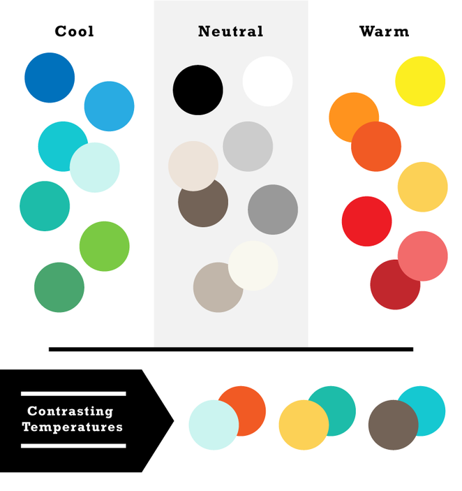 顏色可以根據(jù)色溫分成幾個類型:暖色、冷色和中性色。紅、橘、黃屬于暖色;藍、綠為冷色;黑、白、灰為中性色(在某些情況下淡棕色和棕色也屬于中性色)。在設計種加入不同色溫的顏色搭配可以創(chuàng)造出強烈的對比效果,特別是冷色和暖色搭配。