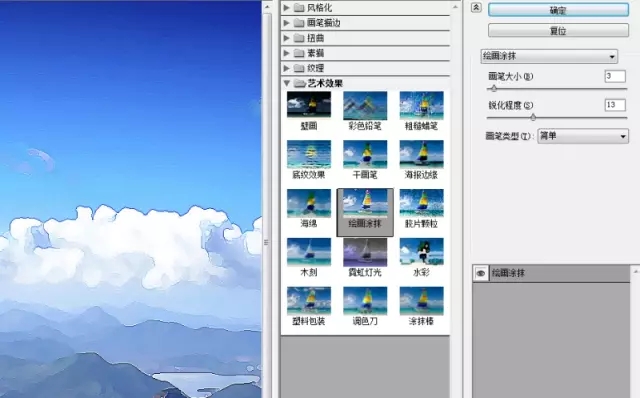 4.這個時候呢復(fù)制一層背景圖片把圖層提到干畫筆圖層上面后再添加濾鏡-濾鏡庫-繪畫涂抹效果