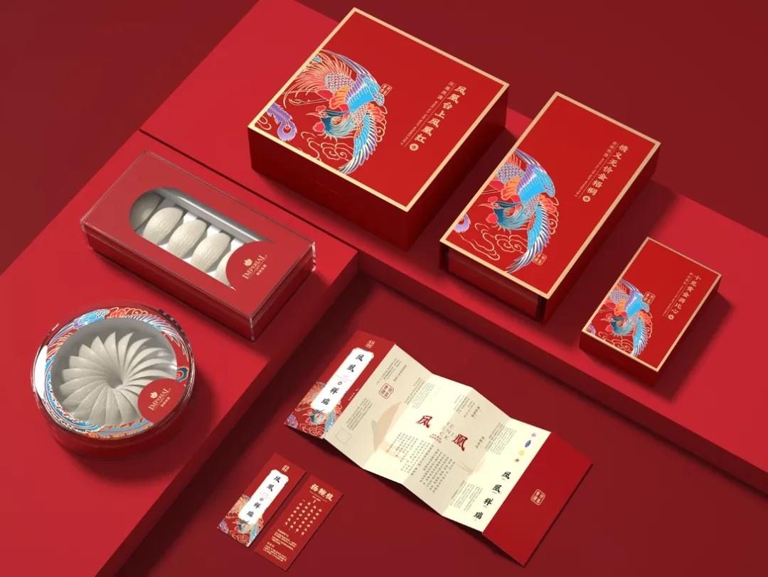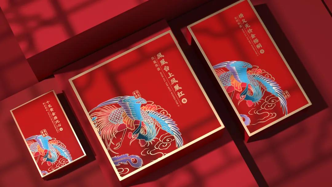 正紅色調(diào)搭配燙金詩(shī)句的外觀包裝,以文點(diǎn)題的傳達(dá)方式,在第一視覺(jué)上就能感受到傳統(tǒng)典禮的調(diào)性。插畫(huà)加入了中國(guó)祥瑞代表--鳳凰元素,以剪影和線描的形式將鳳凰與盒身整體相映襯,表現(xiàn)出了中國(guó)千年文化的韻味和氣息。此外內(nèi)盒還有半透明的亞克力版隔開(kāi)外界,既能很好地保護(hù)產(chǎn)品本身,又能使得華麗的禮盒包裝多了幾分親切感。