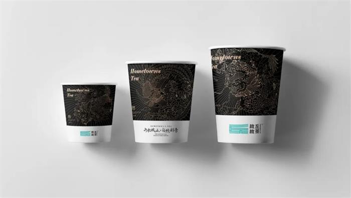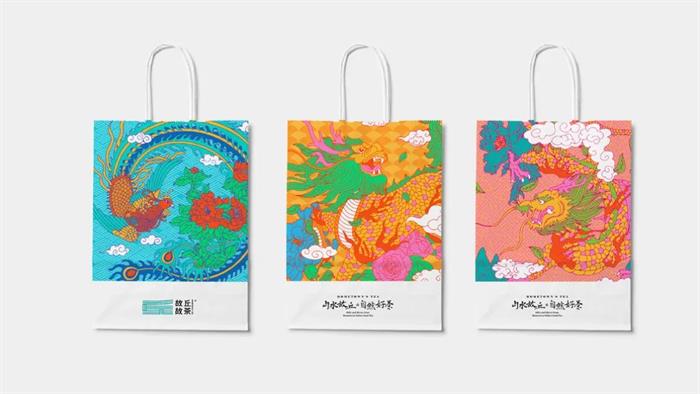 這個茶飲的名字就很古風,品牌的視覺設計主要用插畫來表現(xiàn)。龍與鳳的圖案作為元素,在花和云騰的背景融為一體。最大的賣點在于顏色的搭配,幾種艷麗的顏色調(diào)低飽和度,撞色的手法看起來很出彩。圖案的處理使用線描的方式,用新式的國潮風格來演繹,像這樣中國風的茶飲外表還是很引人注意。去掉顏色,又是一番風景,反差色的多線條設計很密集,勾勒出來的圖形顯得很有氣勢。