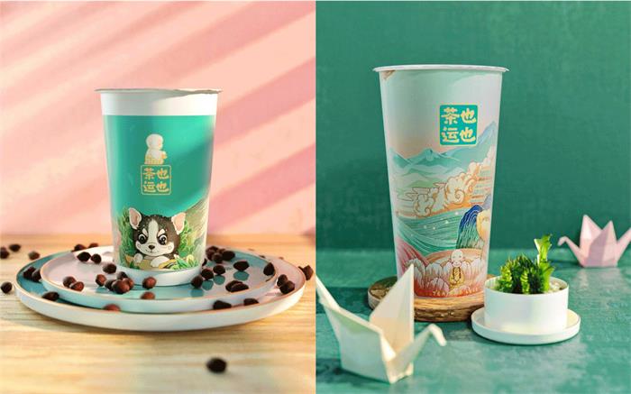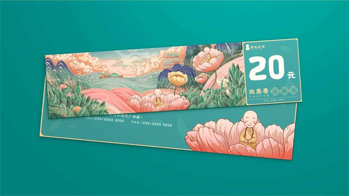 茶也運也是一個茶飲品牌,名牌名稱的含義為:獻上一杯好茶再祝福大家一生好運。是一個很正向的愿景。而由一個小和尚來傳達這種祝福,再合適不過了,所以茶也運也的LOGO圖案是選擇了小和尚的形象。圖案選擇了以小和尚的側面來展現(xiàn),小小一團跪坐在地上,手里拿著茶壺作倒茶姿勢,整一個形象看起來圓滾滾的,非?蓯郏〔枰策\也的字體部分框于外輪廓為黃色,背景色為青色的方形中,字體線條和小和尚的形象一樣,是圓滑且?guī)еc歪扭的,禪意又靈性。而之所以選擇黃色和青色這樣的顏色結合,是因為國潮風格里,這兩種顏色常常是伴隨著一起出現(xiàn)的,加上白色的過渡,會使整個品牌形象設計更加和諧豐滿。茶葉運也的輔助圖形由小和尚、插畫、樹葉以及飲料瓶等元素組成,用簡筆畫的方式展現(xiàn)出來,增添了不少可愛的氣息茶飲菜單設計成塔牌的形式,產(chǎn)品圖采用手繪的方式展現(xiàn),看起來清新香甜。然而其國潮插畫才是此次品牌設計的最大亮點,這組國潮插畫繪制很是精美,對于山水場景的刻畫恢弘大氣,對于動物人物的理解,也比較獨特。每幅插畫都有特定的故事。
