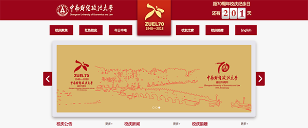 中南財經(jīng)政法大學(xué)是中華人民共和國教育部直屬的一所以經(jīng)濟學(xué)、法學(xué)、管理學(xué)為主干,兼有哲學(xué)、文學(xué)、史學(xué)、理學(xué)、工學(xué)、藝術(shù)學(xué)等九大學(xué)科門類的普通高等學(xué)校,是國家“211工程”高校和“985工程優(yōu)勢學(xué)科創(chuàng)新平臺”項目重點建設(shè)高校,入選世界一流大學(xué)和一流學(xué)科(簡稱“雙一流”)建設(shè)高校及建設(shè)學(xué)科名單。學(xué),F(xiàn)有兩個校區(qū),南湖校區(qū)位于風(fēng)景秀麗的南湖水畔,首義校區(qū)位于歷史悠久的黃鶴樓下。時光的流轉(zhuǎn)中,中南財經(jīng)政法大學(xué)將于2018年迎來她的70周年華誕。極地視覺設(shè)計形象升級