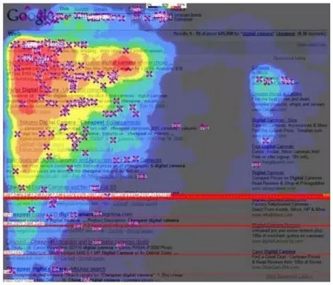 在谷歌搜索頁面,前五個(gè)搜索結(jié)果獲得的“眼球”最多。紅線代表你必須滾動(dòng)鼠標(biāo)翻頁了。