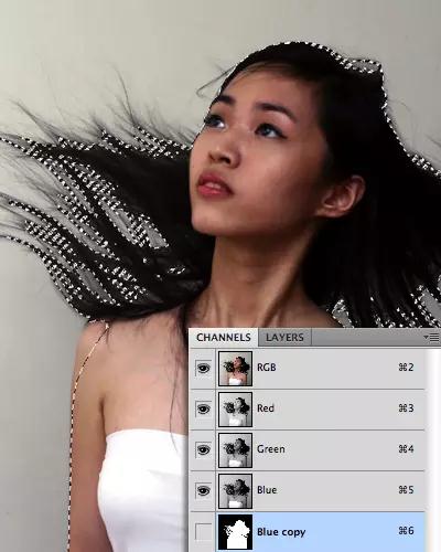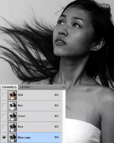 點(diǎn)擊每一個(gè)圖層,找出圖層背景和頭發(fā)部分顏色差異最大的圖層。然后,復(fù)制該圖層。