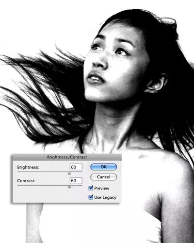 選擇被復(fù)制的圖層,點(diǎn)擊圖像>調(diào)整>亮度/對(duì)比度,在不減少發(fā)絲的前提下,盡可能地調(diào)高亮度和對(duì)比度。理想狀態(tài)下,可以將背景調(diào)成純白色,而頭發(fā)為純黑色。