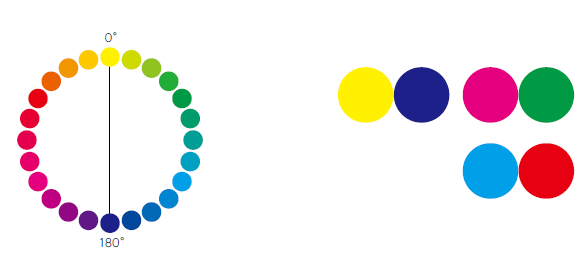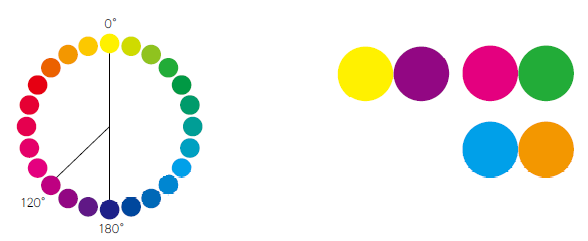 色環(huán)上色相間的夾角在120°到180°之間是強(qiáng)對(duì)比,這樣的對(duì)比看上去鮮明活潑且形成強(qiáng)烈的視覺(jué)沖擊,但如果處理不當(dāng)?shù)脑捒赡軙?huì)帶來(lái)視覺(jué)疲勞、不安全感和不協(xié)調(diào)感。