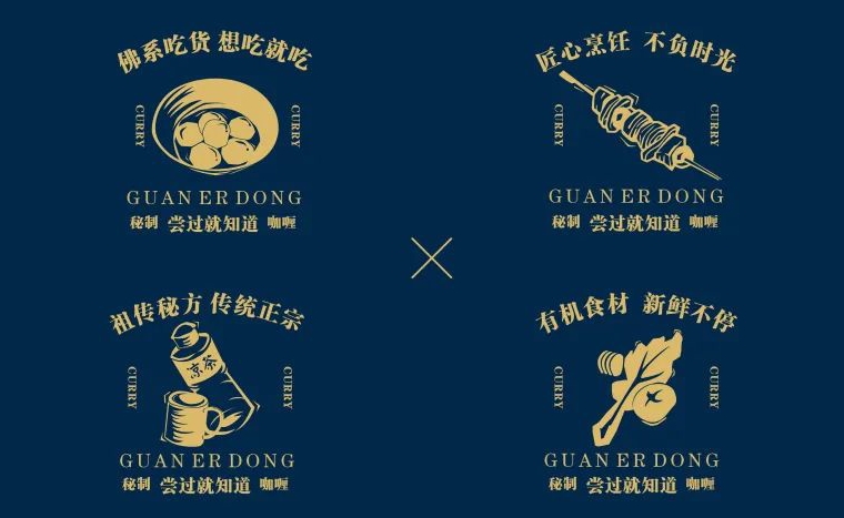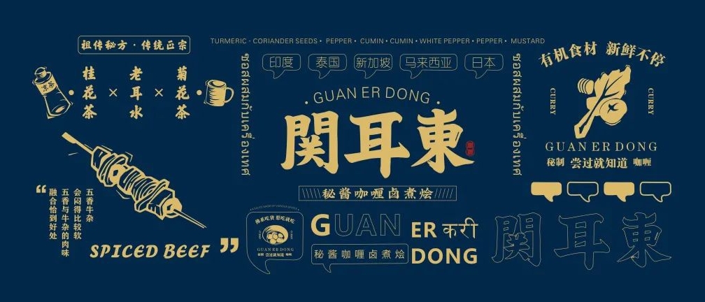 関耳東是一家從事餐飲咖喱牛雜店,而咖喱的種類(lèi)很多,以國(guó)家來(lái)分,源地就有印度、斯里蘭卡、泰國(guó)、新加坡、馬來(lái)西亞等,以顏色來(lái)分,有棕、紅、青、黃、白、之別,根據(jù)配料細(xì)節(jié)上的不同來(lái)區(qū)分種類(lèi)口味的咖喱大約有十多種之多,這些迥異不同的香料的匯集在一起,就能夠構(gòu)成各種咖喱的各種令人意想不到的濃郁香味。VI設(shè)計(jì)的靈感來(lái)自于咖喱文化核心元素,從而提取出金箔重疊的字體設(shè)計(jì)。