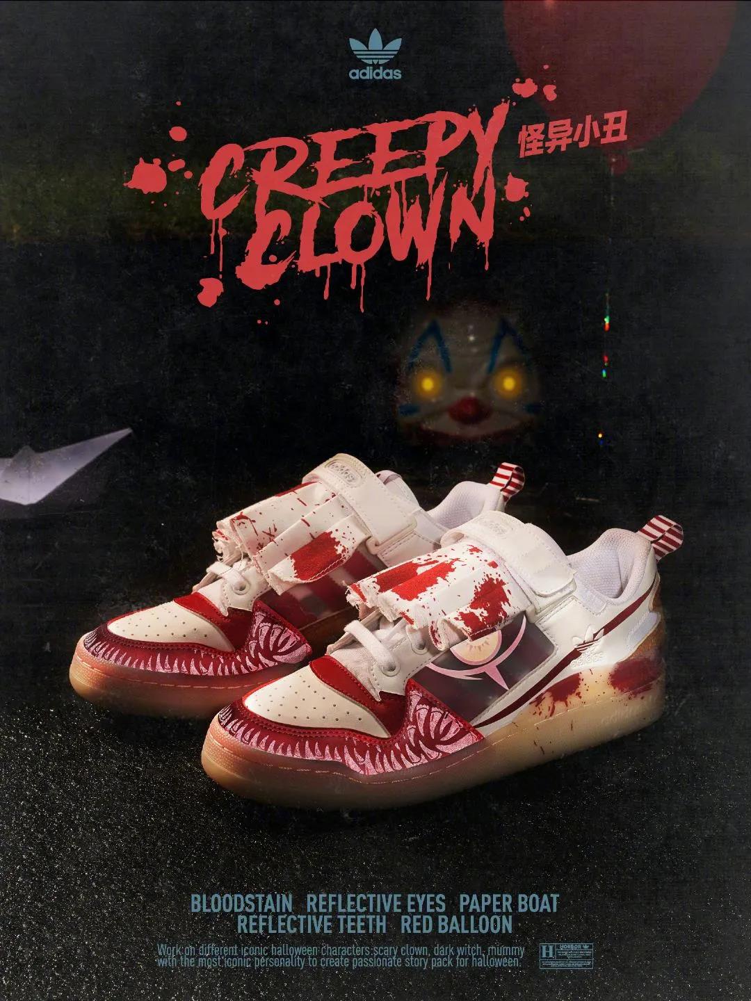 當(dāng)然一些品牌商家們還是會借勢搶占市場、搶奪眼球。比如adidas出品了Originals Halloween系列,進(jìn)入阿迪首頁就滿滿的恐怖氛圍。阿迪這次的萬圣「心動」體驗(yàn)系列可謂是主題感、氛圍感十足,再加上復(fù)古恐怖風(fēng)格的海報設(shè)計。讓我們一起來欣賞一下:小丑面龐反光呈現(xiàn),“鞋”惡獠牙布滿鞋身