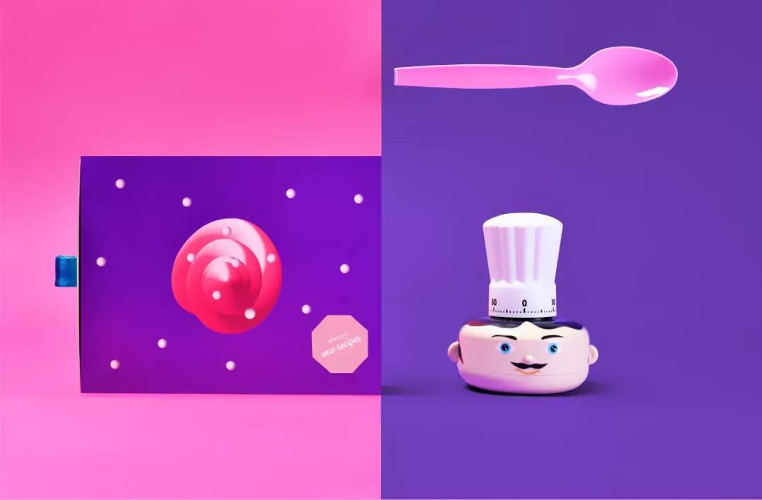 這是一個(gè)傳達(dá)快樂的糕點(diǎn)烘焙品牌,通過采用鮮艷明亮的色調(diào)搭配可愛有趣的圖形,創(chuàng)造出一些象征糕點(diǎn)的三維圖形,包括一些包裝、勺子道具等,給人一種愉悅舒適的新鮮感。