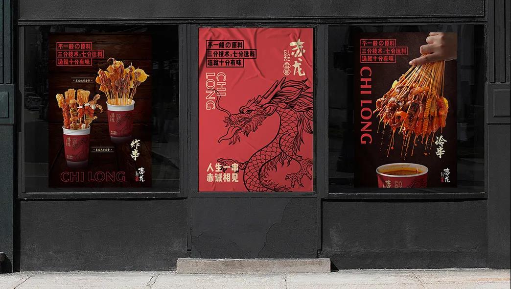 這個炸串品牌叫赤龍炸串,圍繞赤龍的品牌名,原創(chuàng)手繪出一條翻江倒海,爪持串物的龍形象。LOGO設(shè)計是中文字體和拼音的結(jié)合,赤龍二字用毛筆揮斥而成,赤龍的拼音在和串屋二字連結(jié),重在突出赤龍的品牌名稱。輔助圖形采用日式匠心經(jīng)典“燒鳥”造型,結(jié)合本地傳統(tǒng)炸串,演繹誕生出新一代解饞美味。