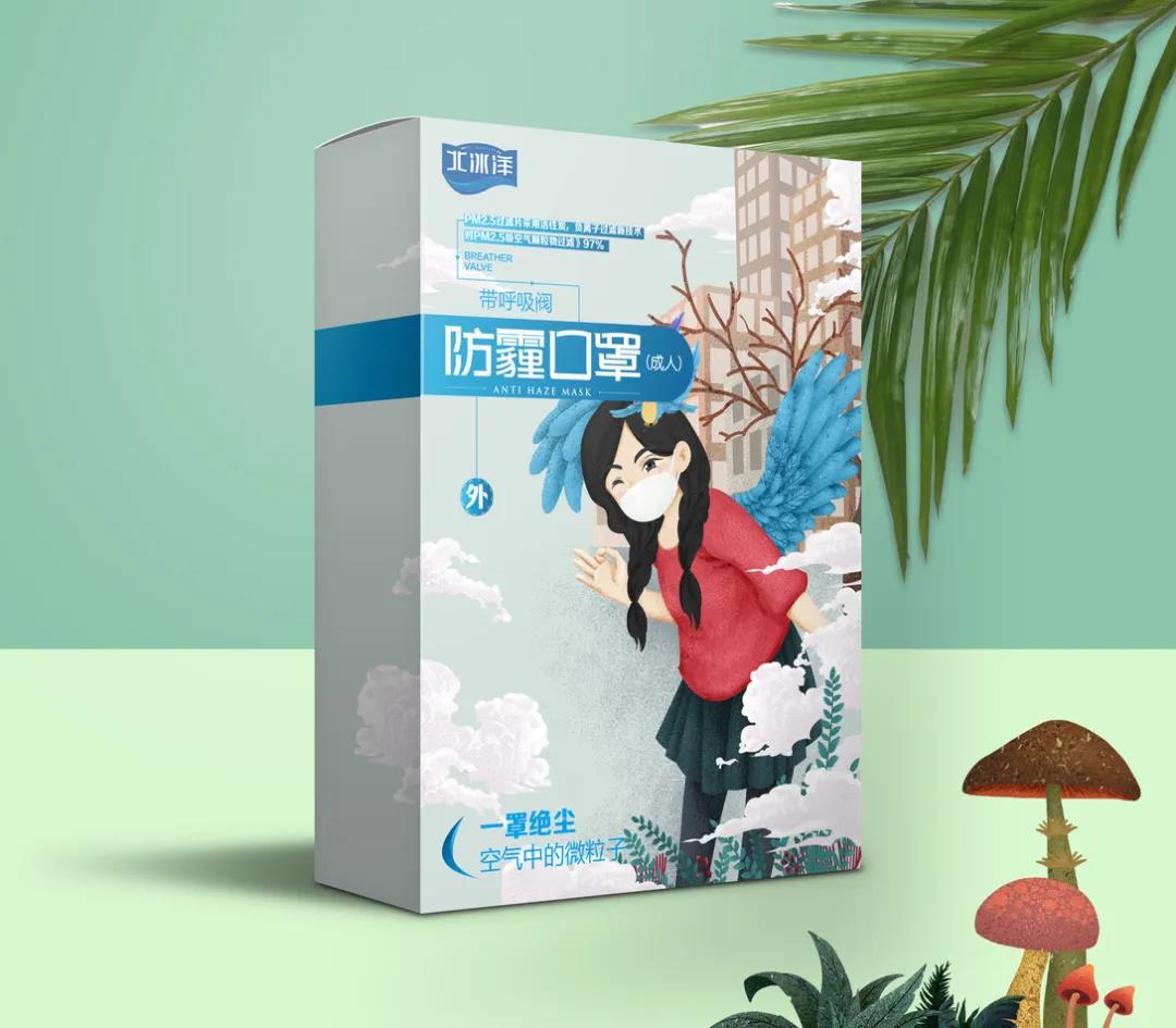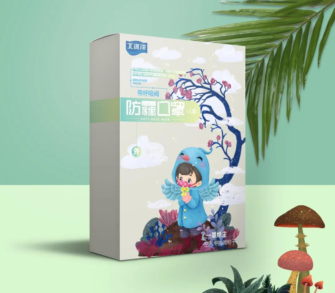 這款包裝乍一看以為只是簡(jiǎn)單的IP形象,但在其身后加入了翅膀的插畫設(shè)計(jì),通過(guò)擬物化手法進(jìn)行創(chuàng)意描繪,在口罩設(shè)計(jì)上擁有自己的區(qū)分亮點(diǎn)。