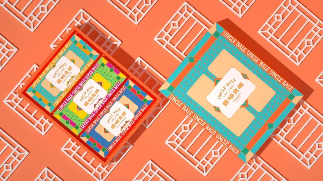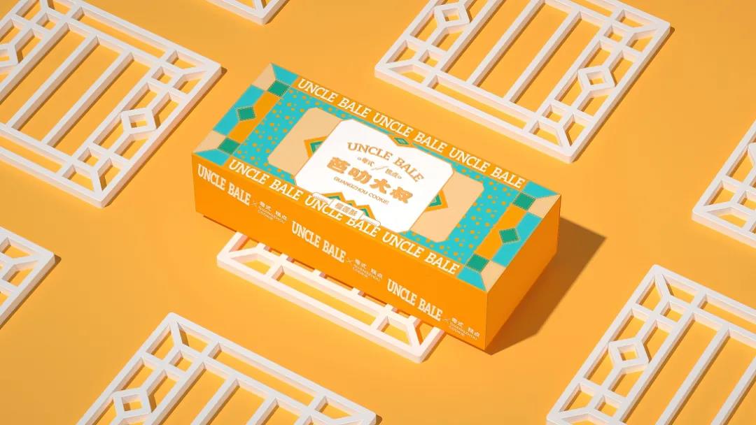 這款糕點(diǎn)采用高飽和度的暖色調(diào)設(shè)計(jì),輔以封面中的幾何圖形撞色搭配,扁平化的形式勾勒了經(jīng)典窗格的紋路元素,視覺(jué)上更具異域風(fēng)情。居中排版的LOGO以徽標(biāo)呈現(xiàn),金色描邊搭配趣味的中英文字體設(shè)計(jì),平衡整體視覺(jué)美感的同時(shí),增強(qiáng)消費(fèi)者對(duì)產(chǎn)品的好奇心理。