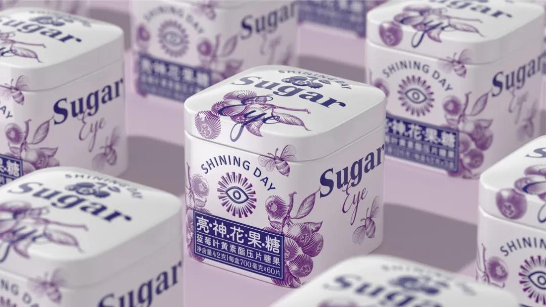 鐵罐盒的小巧包裝方便用戶隨時(shí)攜帶,另外在琳瑯滿目的貨架陳列上,結(jié)合整潔清爽的畫面設(shè)計(jì),用戶也能迅速捕捉鐵罐的糖果屬性,進(jìn)一步突出產(chǎn)品的健康、優(yōu)質(zhì)。外盒包裝延續(xù)一致的風(fēng)格,居中排版的人眼睛巧妙結(jié)合了太陽(yáng)元素,如同正放射光芒的熾烈陽(yáng)光,突出了產(chǎn)品“護(hù)眼”的功能屬性,進(jìn)一步強(qiáng)化人們對(duì)“保健類”糖果的印象。