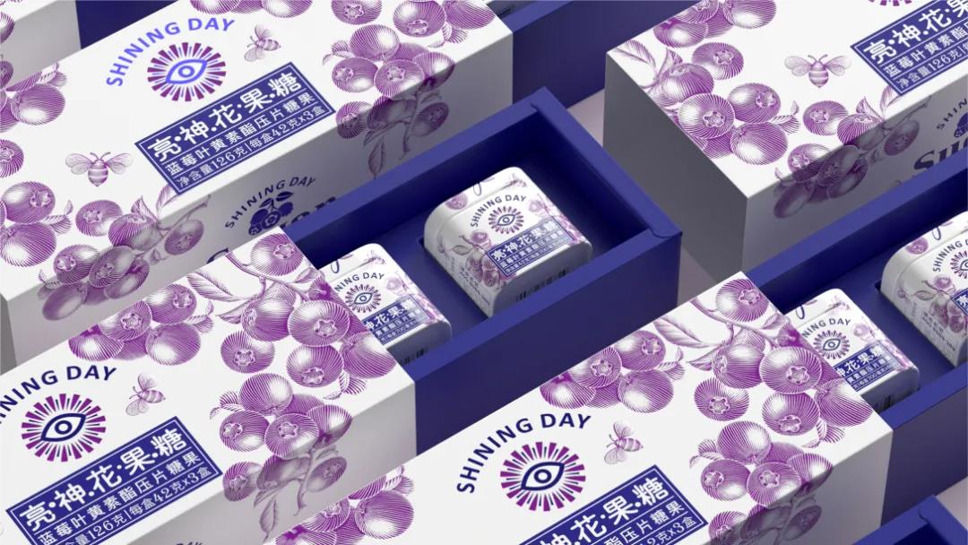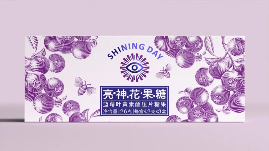 另外手繪插畫的風(fēng)格,呼應(yīng)了品牌所要追求的休閑感,并以藍(lán)紫雙色調(diào)的重疊碰撞,描繪出蜜蜂正在圍繞新鮮藍(lán)莓采蜜的畫面,表達(dá)出產(chǎn)品的口味特點(diǎn),對(duì)稱式布局盡顯天然美感。抽拉式禮盒設(shè)計(jì),節(jié)省了用戶開啟禮盒的時(shí)間,給予消費(fèi)者更舒適的感觀體驗(yàn)。最后產(chǎn)品的slogan,以“嚼一嚼”為視覺(jué)語(yǔ)言,激發(fā)消費(fèi)者對(duì)產(chǎn)品使用的好奇心理,讓護(hù)眼的過(guò)程也變得輕松、愉悅。