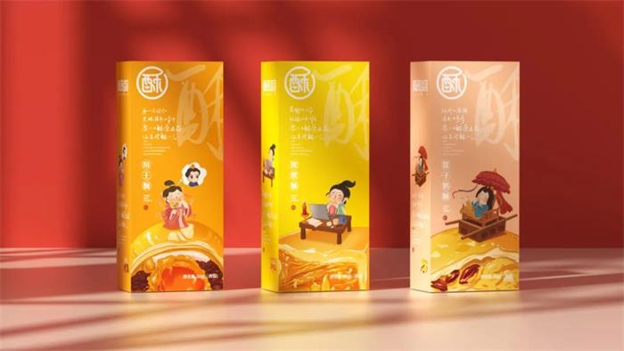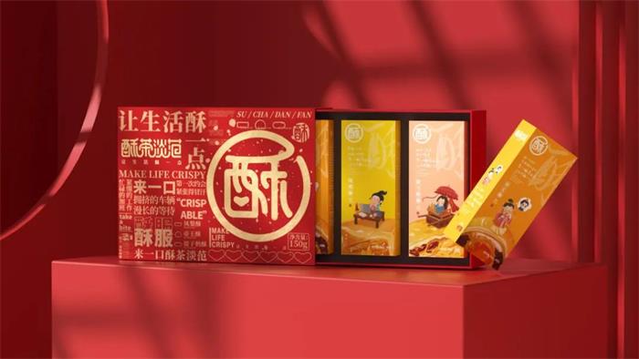 蘇州食品包裝設(shè)計(jì)禮盒分為紅、藍(lán)兩款主色調(diào)包裝,圖形化的“酥”字占據(jù)了大部分封面,柔軟的筆觸與裸粉色調(diào),形成品牌的視覺符號(hào)。左側(cè)則是滿版的產(chǎn)品賣點(diǎn)排版,重點(diǎn)突出“酥服”等俏皮文案,進(jìn)一步強(qiáng)化品牌調(diào)性,以直戳消費(fèi)者痛點(diǎn)的文字表達(dá),激發(fā)其購(gòu)買欲。抽拉式禮盒便捷易開,加之透明內(nèi)封的裝飾保護(hù),賦予包裝更多的收藏和送禮價(jià)值。內(nèi)盒獨(dú)立包裝將畫面定格在古代,古裝小人IP正在認(rèn)真工作、,乘轎外出或品嘗美食,并且將手繪插圖的蛋黃酥為“背景板”,寓意沉浸在美食的世界~
