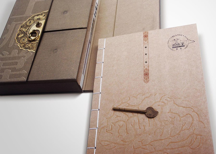 這是一套作品集,作品集正面為大門狀設計,正中裝有銅門扣,意為打開智慧之門,打開后即可看到有擊凸于封面上的大腦。這套書的裝訂方式為古線裝,既體現(xiàn)了古人裝訂技術,又體現(xiàn)了今人的智慧。