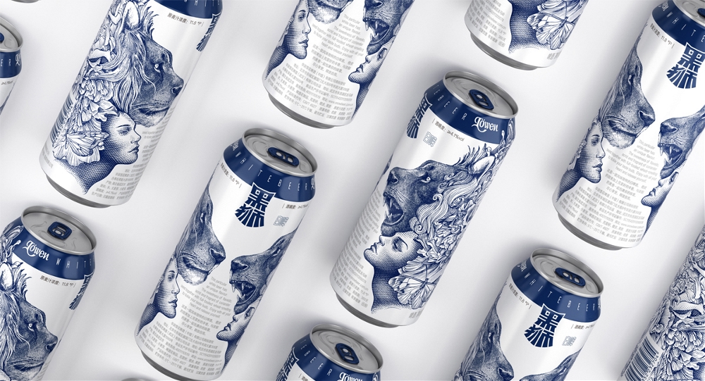 設(shè)計(jì)團(tuán)隊(duì)在包裝插畫上大膽想象:兩只獅子的不同表情,傳達(dá)出人們?cè)陲嬀魄芭c飲酒后兩種不同的情緒表現(xiàn)——克制拘束與熱情奔放,它們繞過柱形罐身相互靠近,就像正在面對(duì)面交流的兩個(gè)人,插畫與罐身之間的適度留白,在視覺上形成了良好的緩沖。