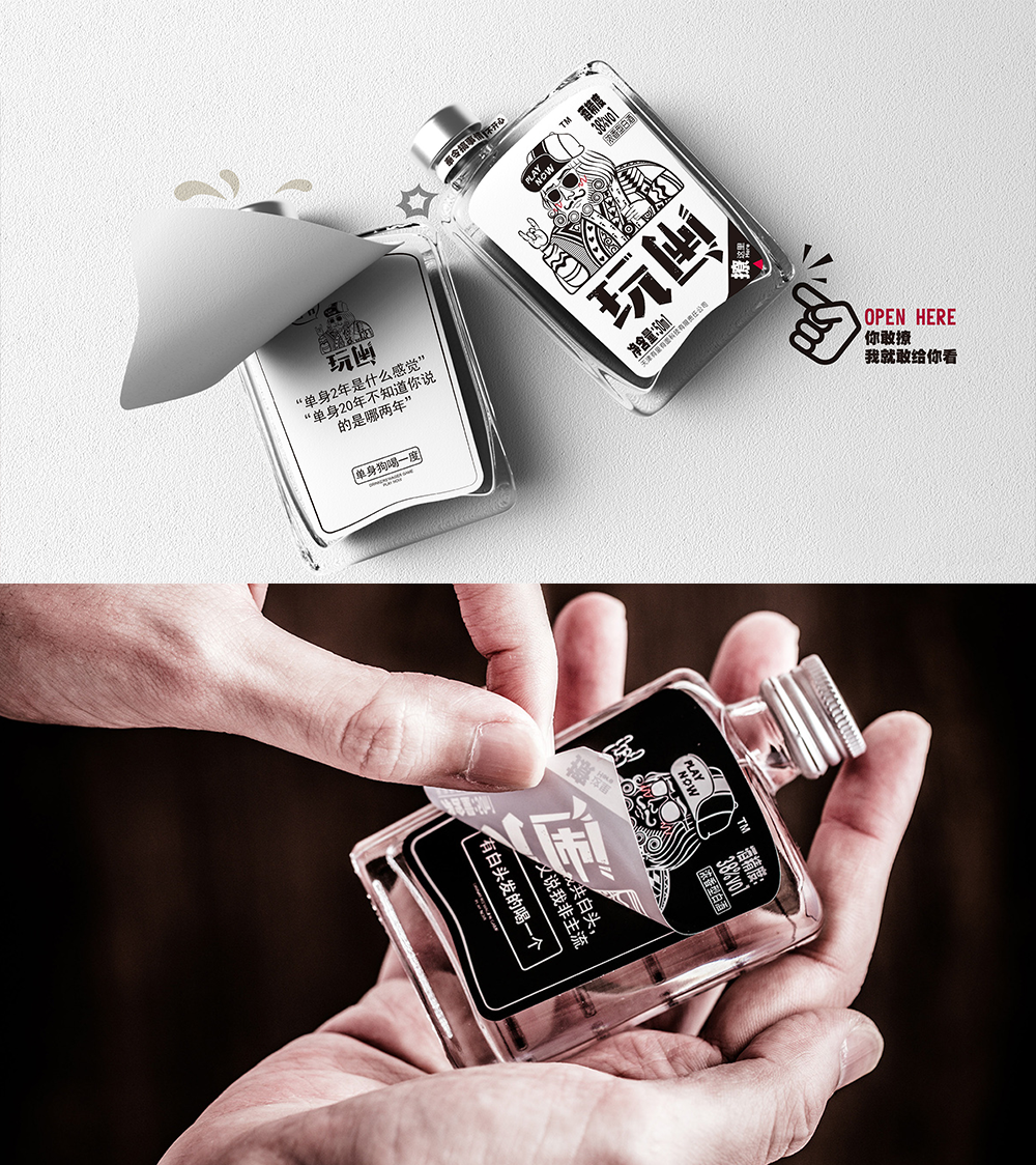 說到小白酒包裝設(shè)計(jì),江小白是很多人心目中的首選,走心文案引發(fā)了消費(fèi)者對(duì)于青春的追憶。如果說江小白是小白酒界的文藝青年,那么這款玩鬧小白酒就是社交達(dá)人,專為聚會(huì)而生。