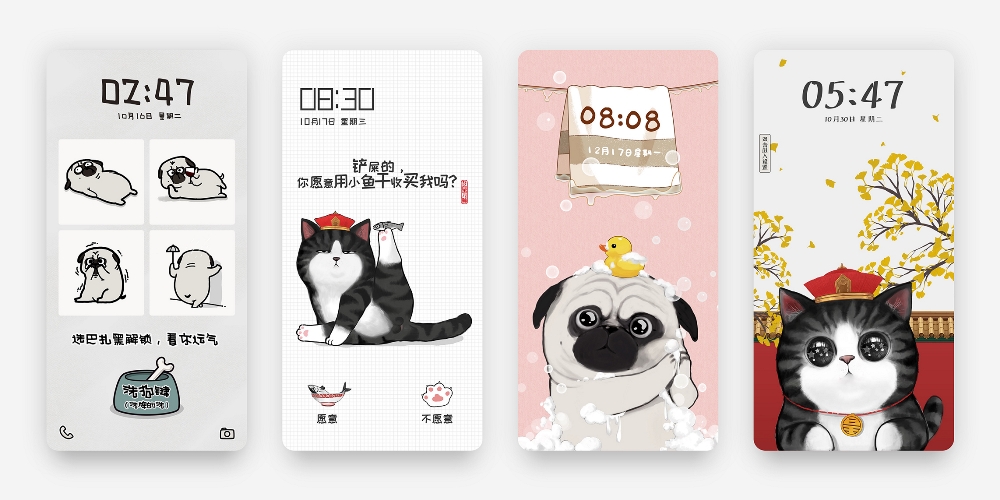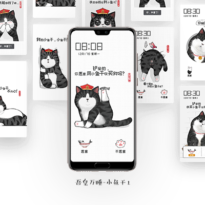 手機主題有趣的地方就在于,不同于靜態(tài)的壁紙,主題是動態(tài)且可以交互的!缎◆~干》的沉浸式交互設計,受到粉絲的一致好評。這款主題以喂吾皇小魚干的第一人稱視角,讓用戶主動選擇喂或不喂,打造了一次新奇的互動旅程。如果用戶選擇不同意喂小魚干,吾皇就傲嬌黑屏,讓你沒有一點防備。若用戶選擇同意,吾皇會人性化引導用戶不斷地摸蛋蛋去掙錢,讓手機屏幕也能體驗一把闖關游戲的樂趣。